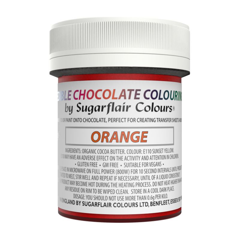 Barva do čokolády od Sugarflair je ideální pro zdobení vašich vlastních transfer folií a přidání dramatických barev do čokoládových výtvorů obecně. Tato řada báječných čokoládových barviv, vyrobená z barevného kakaového másla, je speciálně navržena tak, aby dodala čokoládě živost. Jsou všestranné a snadno se používají, takže je snadné vytvářet ručně vyráběné čokolády. Jednoduše je jemně zahřejte v mikrovlnné troubě, aby se barvy rozpustily, a poté natřete barvivo přes čokoládovou formu nebo na acetátový plát a vytvořte barevné vzory, které promění vaši čokoládovou práci. Obzvláště dobře fungují s bílou čokoládou a vytvářejí zářivý a poutavý záblesk barev. Jednoduše smíchejte barvy do temperované bílé čokolády pro snadný způsob, jak přidat dramatický nádech. Návod k použití: Odstraňte víko a mikrovlnnou troubu na plný výkon (800 W) po dobu 10 sekund, dokud se obsah nezačne rozpouštět. Dobře promíchejte a opakujte, dokud se úplně nerozpustí. Alternativně rozpusťte barvivo umístěním hrnce do teplé vody. Uvědomte si prosím, že výskyt těchto barviv uvnitř hrnce může způsobit poplach kvůli „podobě plísně“, bílým skvrnám a kruhovým značkám na kakaové čokoládě. Můžeme vás ujistit, že tyto značky nejsou plísněmi a jedná se o přirozený proces oddělování známý jako květ kakaového másla nebo „tukový květ“. Toto "kvetení" je způsobeno během výrobního procesu, když je zbarvení ochlazováno nebo temperováno, což způsobuje tvorbu nerovnoměrných krystalů. K růstu plísní potřebuje vodu a čokoláda je klasifikována jako bezvodá (neobsahuje vodu). Pokud čokoládové barvivo znovu rozpustíte, stopy zmizí a bude fungovat a chutnat podle očekávání. Maximální dávkování: 4 g/kg.