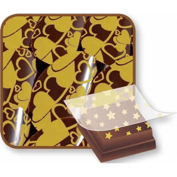 Rozměr: 36,5 x 25 cm (vzor cca 33,5 x 23 cm) Fólie na dekoraci čokolády k použití zejména na pralinky, obtisky na dorty s čokoládovou polevou a ostatní čokoládové výrobky.