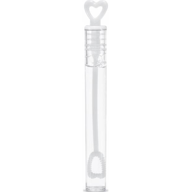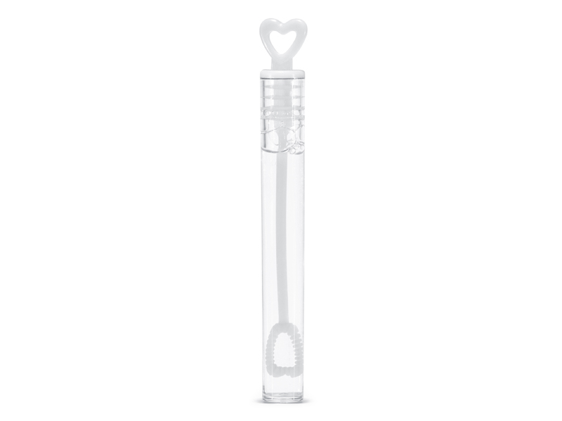 Bílá lahvička se srdcem obsahuje bublinkovou tekutinu. Připravte svým přátelům s pomocí bublifuku atraktivní dekoraci nebo zabavte děti.