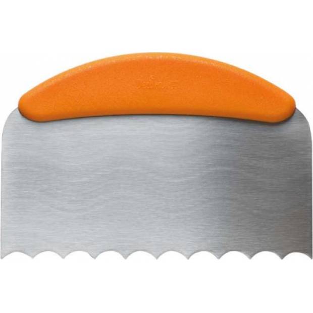 Nerezová špachtle s pohodlnou ergonomickou a protiskluzovou rukojetí. Vlnitá špachtle je ideální pro zdobení okrajů dortů originálními texturami. Více než 20 cm dlouhá čepel je vhodná i pro velmi vysoké dorty.