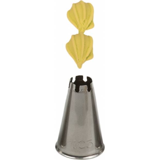 Kovová cukrářská zdobící špička 105 vám zaručí přesnou a jedinečnou výzdobu. Špičku můžete použít se zdobícím sáčkem opakovaně. Je vyrobená z nerezové oceli, na povrchu nezůstávají skvrny od tuku. Není vhodná pro mytí v myčce.