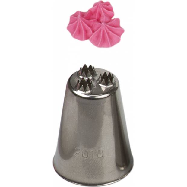 Kovová cukrářská zdobící špička řezaná 2010 trojhvězda na tvoření jemné krémové výzdoby na dortech. Špičku můžete použít se zdobícím sáčkem opakovaně. Je vyrobená z nerezové oceli, na povrchu nezůstávají skvrny od tuku. Není vhodná pro mytí v myčce.