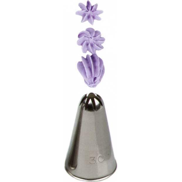 Kovová cukrářská zdobící špička 30 vám zaručí přesnou a jedinečnou výzdobu. Špičku můžete použít se zdobícím sáčkem opakovaně. Je vyrobená z nerezové oceli, na povrchu nezůstávají skvrny od tuku. Není vhodná pro mytí v myčce.