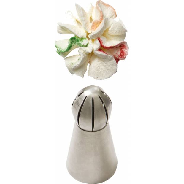 Kovová cukrářská zdobící špička 41 vám zaručí přesnou a jedinečnou výzdobu. Špičku můžete použít se zdobícím sáčkem opakovaně. Je vyrobená z nerezové oceli, na povrchu nezůstávají skvrny od tuku. Není vhodná pro mytí v myčce.