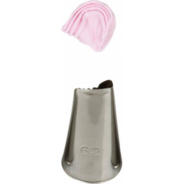Kovová cukrářská zdobící špička 62 pro přesnou a jedinečnou výzdobu z krému. Špičku můžete použít se zdobícím sáčkem opakovaně. Je vyrobená z nerezové oceli, na povrchu nezůstávají skvrny od tuku. Není vhodná pro mytí v myčce.