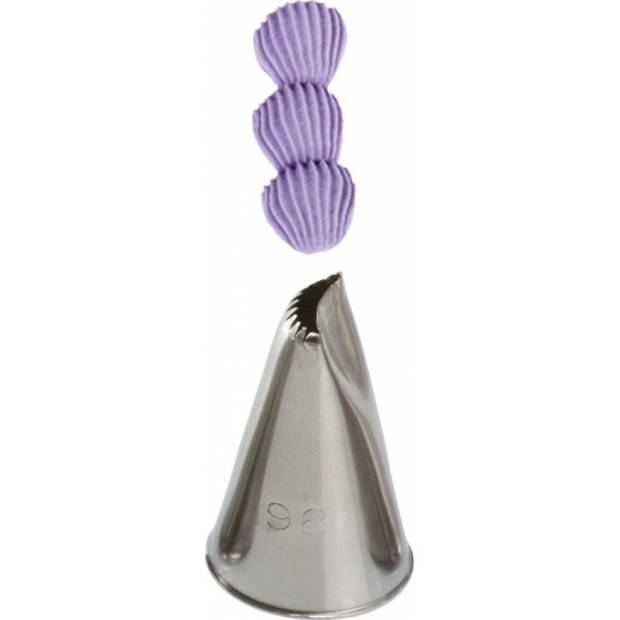 Kovová cukrářská zdobící špička 98 vám zaručí přesnou a jedinečnou výzdobu. Špičku můžete použít se zdobícím sáčkem opakovaně. Je vyrobená z nerezové oceli, na povrchu nezůstávají skvrny od tuku. Není vhodná pro mytí v myčce.