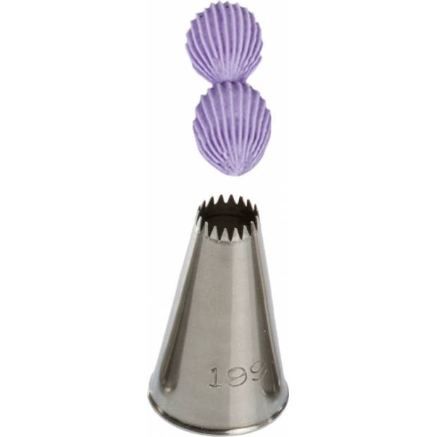 Kovová cukrářská zdobící špička řezaná 199, se kterou zaručeně vytvoříte velmi přesnou a jedinečnou výzdobu. Špičku můžete použít se zdobícím sáčkem opakovaně. Je vyrobená z nerezové oceli, na povrchu nezůstávají skvrny od tuku. Není vhodná pro mytí v myčce.