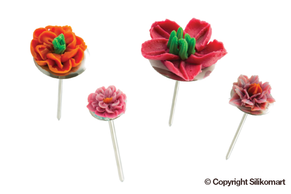 Sada tři podstavců, které slouží k přípravě jedlých květů. Hřebíky držíte za hroty, zatímco hlavice slouží jako podstavce, kde připravíte jedlý květ, který pak pomocí speciálních nůžek nebo nože přenesete na dort. Tato sada se hodí na přípravu většiny typů květů (růže, narcis, sedmikrásky...)