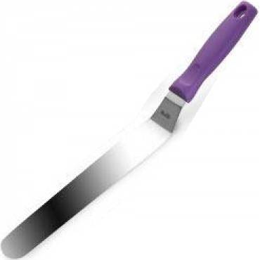 Plastové držátko fialové barvy je příjemné do ruky pro snadnou manipulaci. Cukrářský nůž má čepel z nerezu a délku 25 cm. Čepel je zahnutá, což umožňuje rozetřít krém nebo marmeládu na dortu rovnoměrně a do hladka.