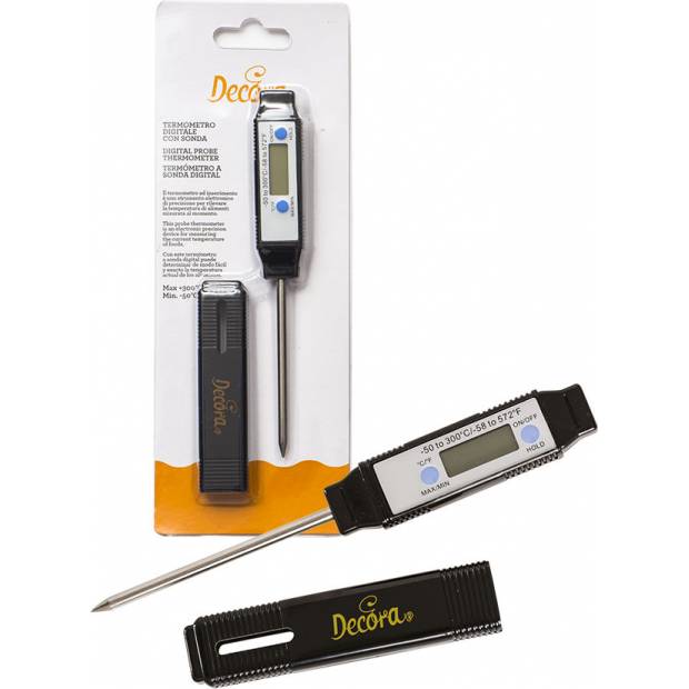 Digitální teploměr s ocelovou sondou, jednoduché použití v kuchyni s měřicím rozsahem -50 + 300 ° C, délka jehly je 7 cm. Ideální pro rychlé a přesné měření vnitřní teploty potravin, nápojů a přípravků.Dodáváno s ochranným krytem. Použití: drůbež, čokoláda, tekuté jídlo, nápoje a přípravky.
