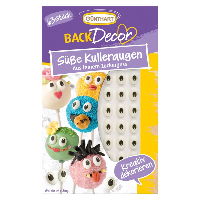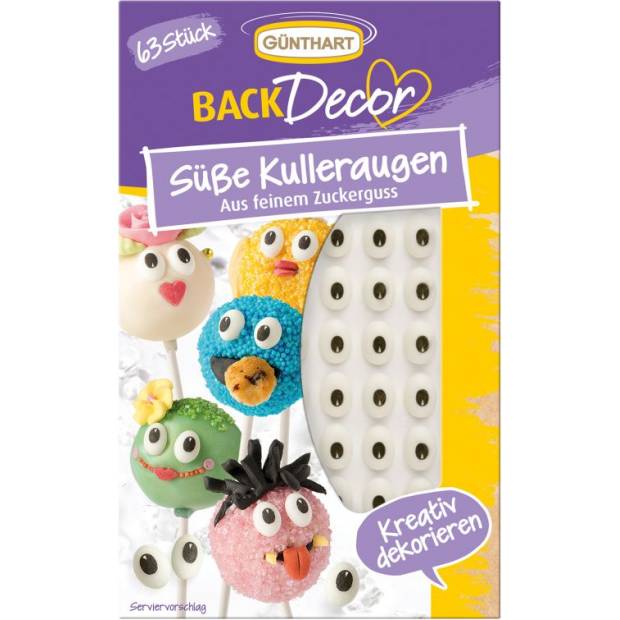 Oči jsou vyrobeny z jemné polevy. Komické oči pro zábavné a kreativní zdobení pečiva, čokoládových pusinek, krémů, dortů, koláčů, zákusků, cupcaků s polevou, muffinů, zákusků nebo zmrzliny. Oči mohou být ozdobeny tak, aby vypadaly tázavě, překvapivě, zvědavě, otravně, zle nebo vtipně | Také pro fondánové nebo dortové figurky vlastní konstrukce. Pro každou příležitost, zvláště k narozeninám dětí. TIP: Na vlhké dezerty nanášejte pouze krátce před podáváním | U pevných dezertů pokládejte krátce před zaschnutím.