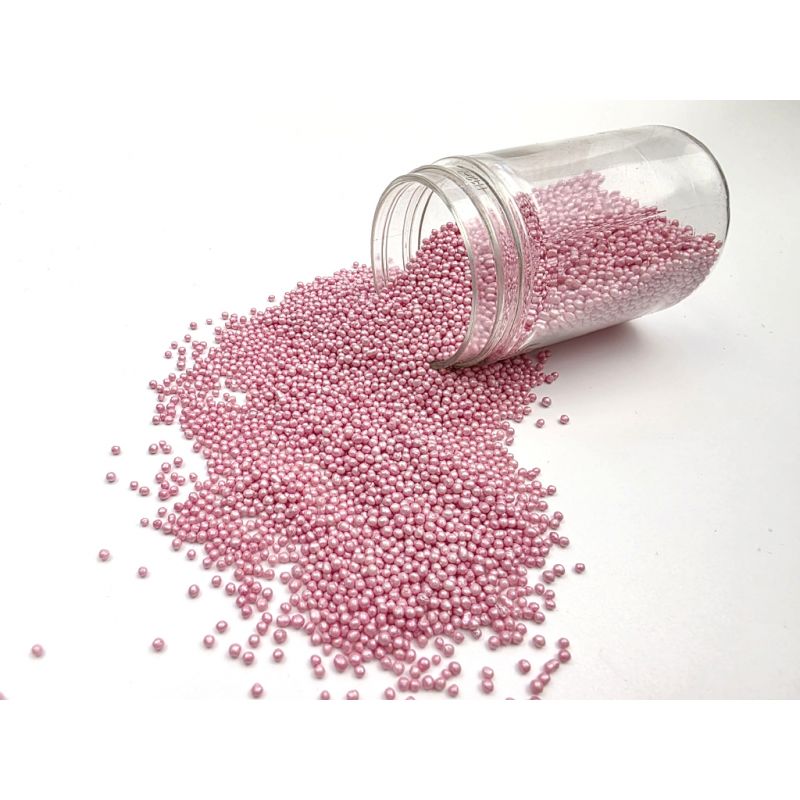 Cukrářské posypky jsou osvědčeným způsobem, jak zajímavě ozdobit dort nebo jinou sladkou pochoutku. Růžové metalické perličky jsou 2 mm velké a umožní vám vytvořit krásnou dekoraci ve vaší domácí kuchyni. Používají je také profesionální cukráři k dozdobení dortů a jiného pečiva. Perličky máme v různých barvách, velikostech. Díky tomu je lze snadno sladit s dalšími detaily na pečivu nebo dezertech. Metalické růžové perličky na zdobení dortů jsou krásným doplňkem hladkého povrchu dortů. Dají se s nimi zdobit i perníčky, drobné cukroví, muffiny nebo dorty. Jedná se o univerzální dekorace, které vám pomohou doladit vaše chutné pečivo. Další obrovskou výhodou perel je jejich snadná aplikace. Stačí je položit na vámi vybraný povrch a je hotovo. Perly se perfektně hodí k cukrové pastě a dalším. Lze je kombinovat s různými krémy. V naší nabídce najdete jemné cukrové perly, které lze bez obav konzumovat i s dezertem. Pokud zdobení nasypete na vláčný krém, vlhkost z něj může posypek změkčit. Ale pozor, pokud bude zdobení na vlhkém krému delší dobu, může se z posypku uvolnit i barvivo a to na povrch krému. Pokud chcete, aby větší části dekorace drželi například na potahovém dortu, můžete tento druh zdobení k dortům lepit polotuhou čokoládou, nebo glazurou na perníčky. s posypky pracujte nejlépe nad miskou, či plechem s okrajem.