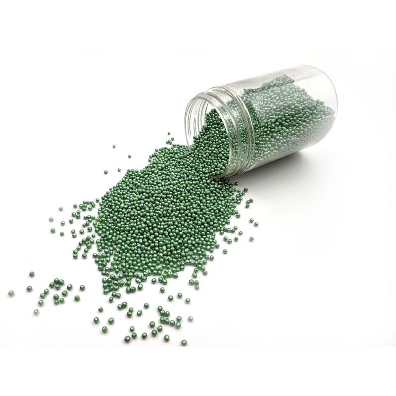Cukrové perličky 2 mm zelené metalické. Balení 80 g.