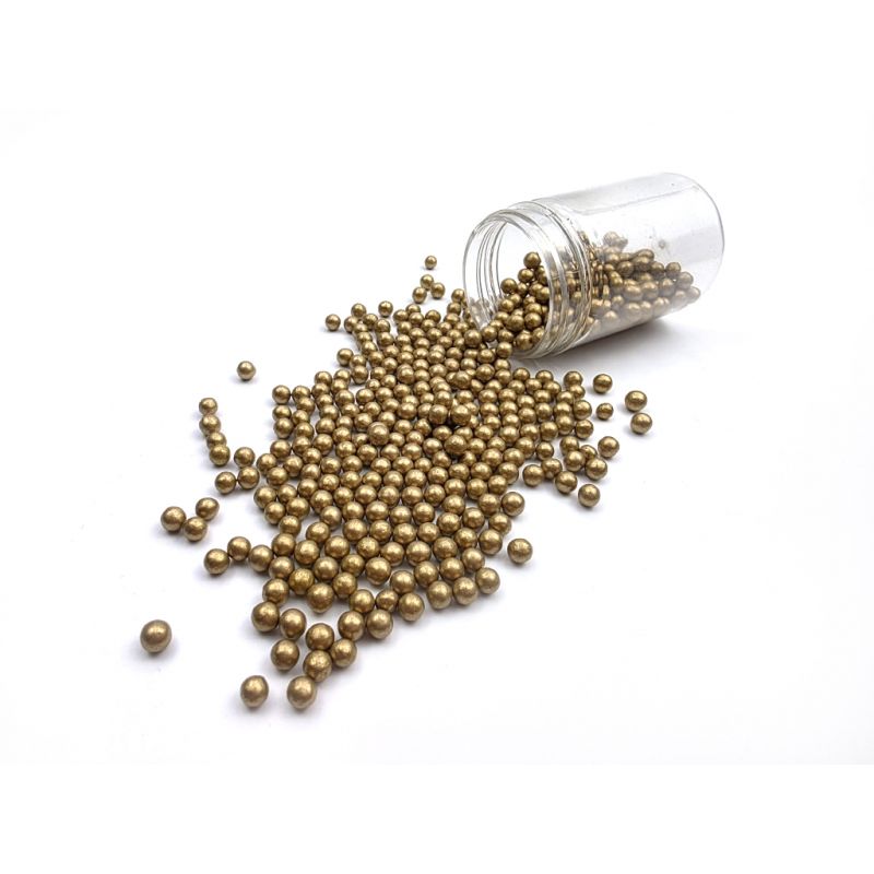 Zlaté metalické cukrové perličky jsou krásným doplňkem hladkého povrchu dortů. Dají se s nimi zdobit i perníčky, drobné cukroví, muffiny nebo dorty. Jedná se o univerzální dekorace, které vám pomohou doladit vaše chutné pečivo. Další obrovskou výhodou perel je jejich snadná aplikace. Stačí je položit na vámi vybraný povrch a je hotovo. Perly se perfektně hodí k cukrové pastě a dalším. Lze je kombinovat s různými krémy. V naší nabídce najdete jemné cukrové perly, které lze bez obav konzumovat i s dezertem. Pokud zdobení nasypete na vláčný krém, vlhkost z něj může posypek změkčit. Ale pozor, pokud bude zdobení na vlhkém krému delší dobu, může se z posypku uvolnit i barvivo a to na povrch krému. Pokud chcete, aby větší části dekorace drželi například na potahovém dortu, můžete tento druh zdobení k dortům lepit polotuhou čokoládou, nebo glazurou na perníčky. s posypky pracujte nejlépe nad miskou, či plechem s okrajem.