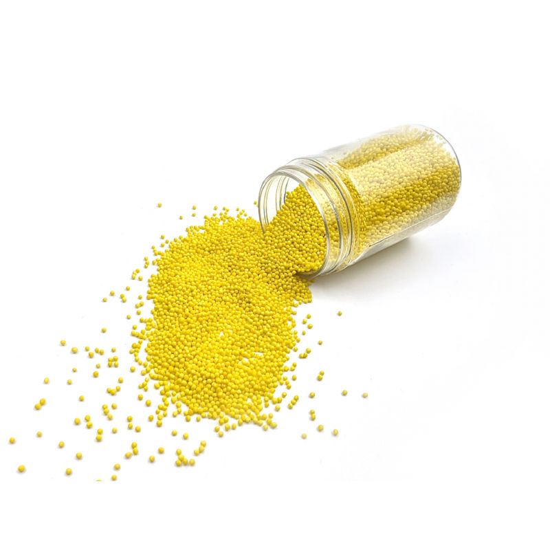 Tyto žluté perličky jsou univerzální cukrová dekorace. Tyto barevné cukrové kuličky dodávají eleganci tradičním i inovativním cukrářským výtvorům. Vysoce kvalitní barviva zaručují barevnou stálost. Perličky na zdobení dortů jsou krásným doplňkem hladkého povrchu dortů. Dají se s nimi zdobit i perníčky, drobné cukroví, muffiny nebo dorty. Jedná se o univerzální dekorace, které vám pomohou doladit vaše chutné pečivo. Další obrovskou výhodou perel je jejich snadná aplikace. Stačí je položit na vámi vybraný povrch a je hotovo. Perly se perfektně hodí k cukrové pastě a dalším. Lze je kombinovat s různými krémy. V naší nabídce najdete jemné cukrové perly, které lze bez obav konzumovat i s dezertem. Pokud zdobení nasypete na vláčný krém, vlhkost z něj může posypek změkčit. Ale pozor, pokud bude zdobení na vlhkém krému delší dobu, může se z posypku uvolnit i barvivo a to na povrch krému. Pokud chcete, aby větší části dekorace drželi například na potahovém dortu, můžete tento druh zdobení k dortům lepit polotuhou čokoládou, nebo glazurou na perníčky. s posypky pracujte nejlépe nad miskou, či plechem s okrajem.