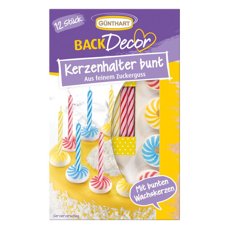 12 krásných barevných voskových svíček v barvách modrá, žlutá a červená. Vhodný nápad na dekorace pro narozeniny a tématické večírky. Součástí je také 12 dalších barevných stojanů na cukrové svíčky. Jsou vhodné na dekorace pro narozeninové dorty, dorty, cupcaky a speciální příležitosti. Cukr, zahušťovadlo E 414, naštěpený MLÉČNÝ PROTEIN, okyselovadlo E 330, zvlhčovadlo E 422, Carthamus koncentrát, rostlinný koncentrát spirulina, emulgátor E 322, barviva: E 120, E 160a. Může obsahovat stopy vajec.