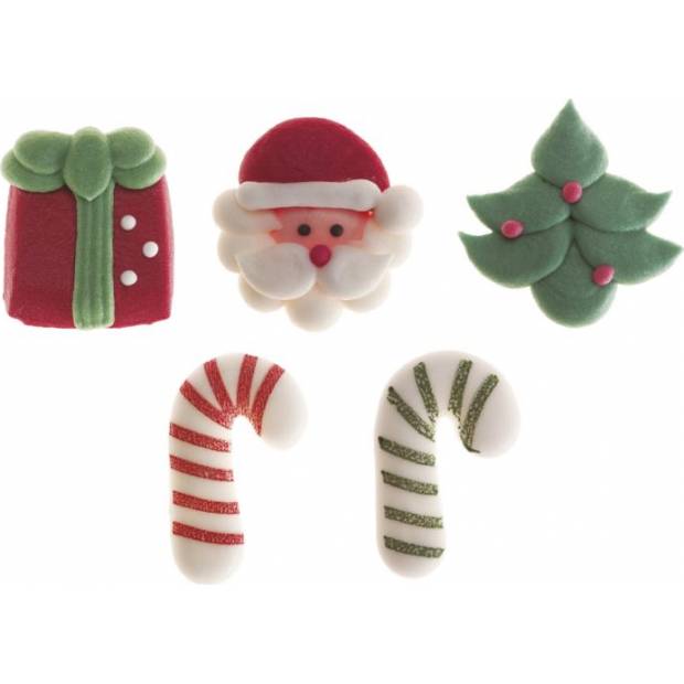 Balení jedlých cukrových ozdob ve tvaru různých vánočních postaviček. Tvary jsou vánoční dárek, Santa Claus, vánoční stromeček a cukrová hůl. Skvělé pro zdobení vánočních cupcaků nebo dortů! Balení obsahuje 12 dekorací.