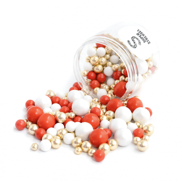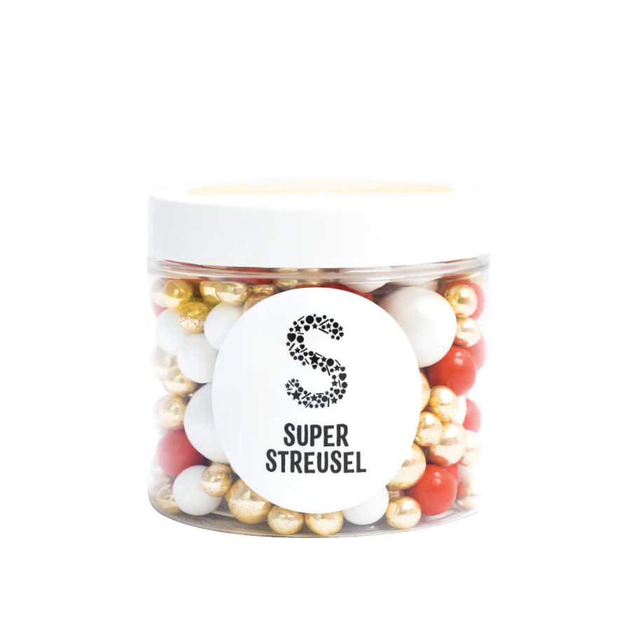 Tyto posypky jsou ideální pro zdobení nejrůznějšího pečiva jako jsou dorty, muffiny, sušenky atd. Tyto jedlé dekorace jsou skvělé pro vánoční zdobení. Tyto kvalitní potraviny lze použít na koblihy, cupcaky, dorty, zmrzlinu, sušenky a mnoho dalšího. Jedlé posypky od Super Streusel přinesou jiskru, lesk a spoustu barev vašim dortům, cupcakům, sušenkám, dezertům, zmrzlině, nápojům, koktejlům, mléčným koktejlům a dalším. Jsou vyrobené z těch nejlepších ingrediencí a přirozeně obarvené pomocí potravinářských barviv dodají barvu a šmrnc každé příležitosti. Posypy Super Streusel jsou dokonalým doplňkem na narozeninové oslavy, svatby nebo jakékoli zvláštní příležitosti a jsou k dispozici v široké škále barev, tvarů a směsí. Složení: cukr, pšeničný škrob, dextróza, b