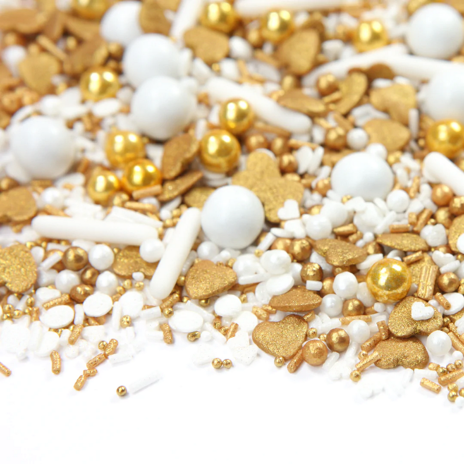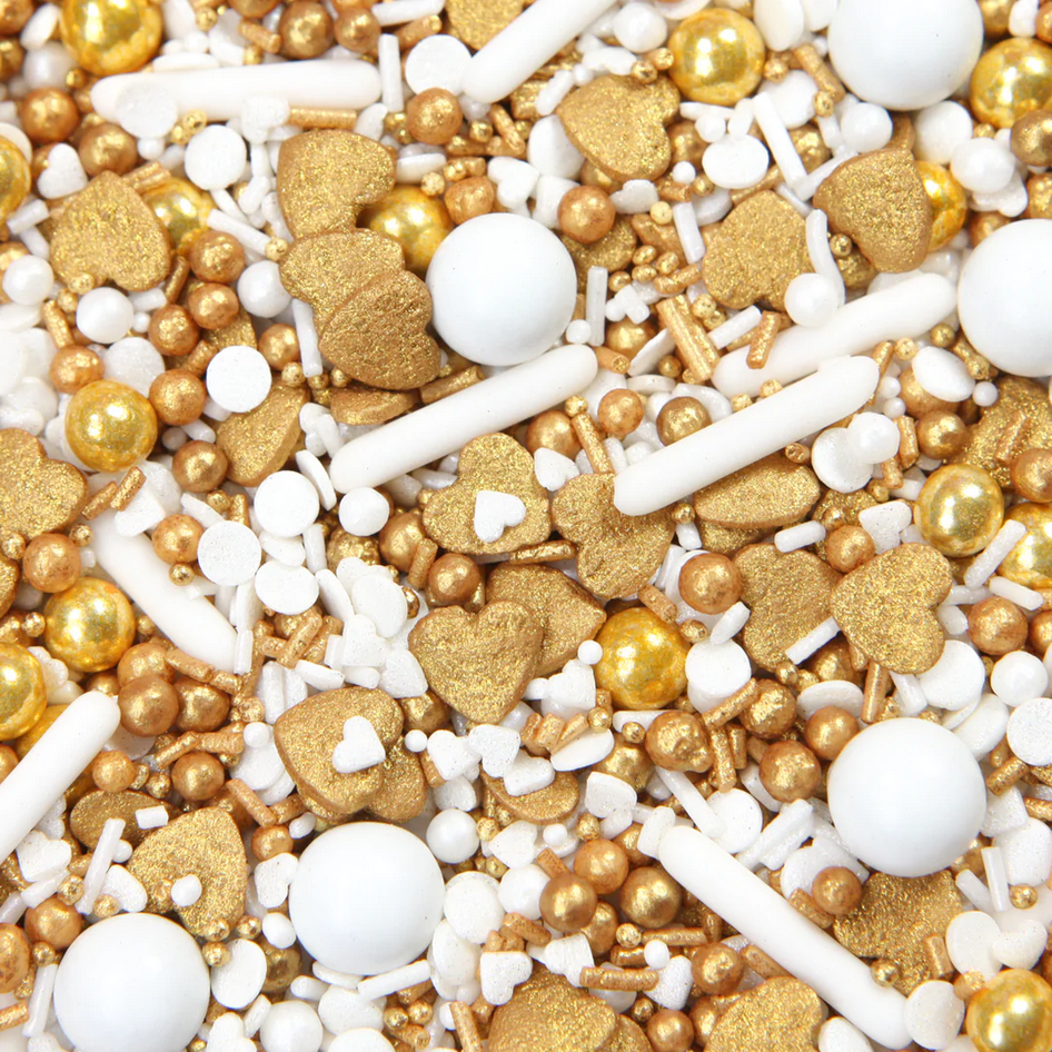 Třpytivá srdíčka a zlaté čokoládové koule doslova křičí teplo a lásku. Velké bílé čokoládové kuličky a cukrové tyčinky jsou ztělesněním něhy a oddanosti. Tento mix třpytek je prostě absolutní bomba a promění vaše dorty a zákusky v jedinečný poutač.