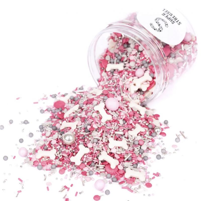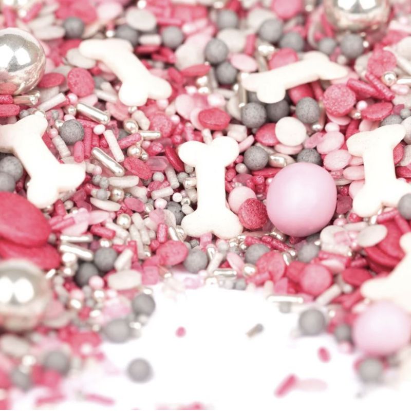 Dosáhněte se svými pečícími misemi až na samotný vrchol. Směs nazvaná Wuffelinchen neohroženě vyšperkuje vaše dorty, cupcaky nebo dorty na narozeninovou oslavu. Ideální pro všechny psí fanoušky, velké i malé, kteří mají rádi růžovou a chtějí věnovat svou tematickou párty našim chlupatým hrdinům. Malé kosti, růžové a šedé konfetové posypy, růžové a stříbrné nonpareils a čokoládové kuličky jsou připraveny k použití 24 hodin denně na narozeninové dorty, tématické dorty nebo muffiny v psím stylu. Podlouhlé tyčinky obsahují tenké, syrové nudle potažené cukrem. Jsou sice jedny z nejhezčích, ale také nejtěžších, co naše směsi nabízejí. Užívejte si tedy s rozvahou. Kuličky: Naše střední a velké kuličky jsou všechny lahodně plněné jemnou čokoládou nebo křupavé křupavé. Báječný! Míchání: Během přepravy se velké posypy a čokoládové kuličky obvykle sesypou do středu plechovky. Abyste se mohli pokochat plnou sypanou nádherou, stačí plechovku vyklopit do misky a nechat se okouzlit. Složení: cukr, glukóza, pšeničný škrob, bramborový škrob, glukózový sirup, slunečnicový olej, rýžová mouka, rostlinný olej (kokos), mléčná čokoláda [cukr, kakaové máslo, sušené plnotučné mléko, kakaová hmota, emulgátor: sójový lecitin, přírodní vanilkové aroma ], sušenková náplň [rýžová mouka, pšeničná mouka, cukr, pšeničná sladová mouka, pšeničný lepek, sůl], pšeničná mouka, stabilizátor: arabská guma, cukerné estery mastných kyselin, agar; Škrob (rýžový/kukuřičný), kakaové máslo, barviva: E120, E153, E172, E174; Nátěrové látky: šelak, včelí vosk, karnaubský vosk; Může obsahovat stopy ořechů. Obsah energie a živin na 100 g: Energie: 1724 kJ/407 kcal; Tuky: 3,3 g, z toho nasycené mastné kyseliny: 1,5 g; Sacharidy: 93,6g, z toho cukry: 87,7g; Bílkoviny: 0,8g; Sůl: 0,02 g