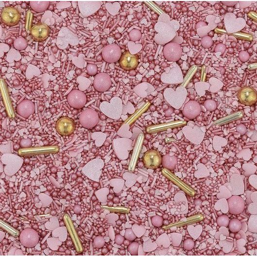 Tato barevná posypová směs se nedá porazit, pokud jde o vydatnost. Amorovy šípy vystřelují z každého rohu plechovky. Vezměte růžová cukrová srdíčka, růžové cukrové posypky, růžové korálky, velké růžové a zlaté čokoládové kuličky, nezapomeňte na zlaté cukrové tyčinky a začněte se zdobením. Tato růžovo-růžová a zároveň zlatavá posypová směs bude třešničkou na dortu na vašem dortíku, růžovým pokušením na polevě na cupcake, poutačem na cukroví ke Dni matek. Během přepravy se velké cukrové posypy a čokoládové perly obvykle sypou do středu plechovky. Vysypejte sypání do hlubší misky a zdobte. Pozor: Podlouhlé kovové dražé obsahují tenké, syrové nudle, které jsou potažené cukrem. Jsou sice jedny z nejhezčích, ale zároveň jsou tím nejtěžším, co naše směsi nabízejí. Užívejte si tedy s rozvahou.