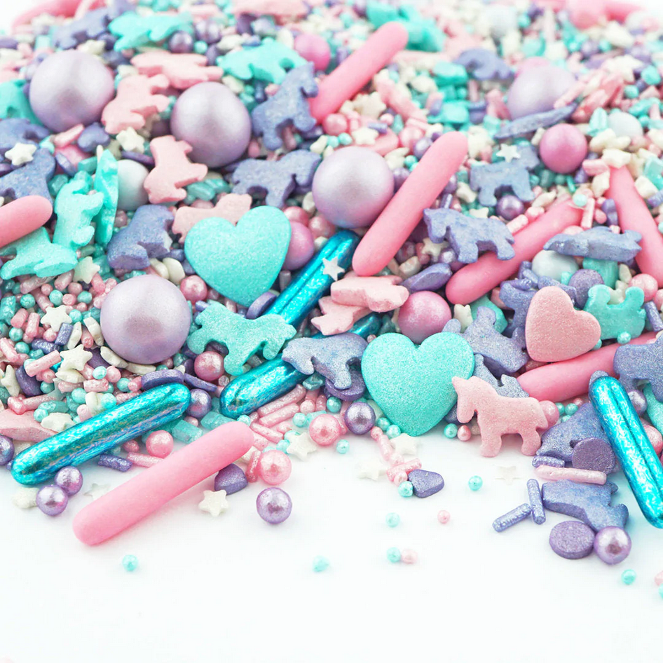 Směs posypů nadchne nejen holčičky, které jednorožce milují. Kromě růžových jednorožců najdete také kousky obřích srdcí, konfet a třpytivých cukrových posypů. K tomu pořádná porce čokoládových kuliček v barvě lila, modré a růžové cukrové tyčinky.