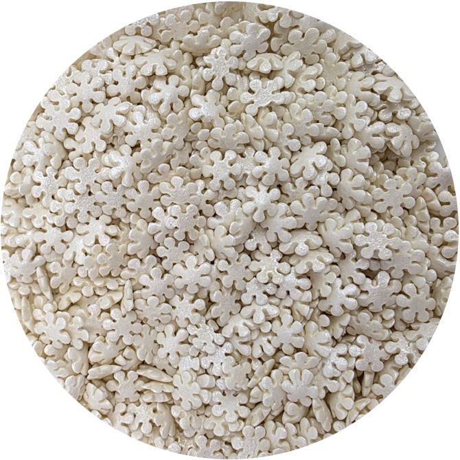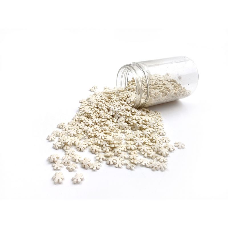Cukrové posypky v podobě bílých sněhových vloček jsou perfektní ozdobou dortů, koláčů a dalšího pečiva. Vločky dodají kouzlo a romantickou atmosféru každé kompozici dezertu. Díky nim můžete vyjádřit krásu jedinečným a vkusným způsobem. Tyto dekorativní prvky jsou perfektní pro zdobení dortů k různým příležitostem, jako jsou narozeniny, Vánoce, ale i zásnuby nebo výročí, dodávají jim jedinečné kouzlo a eleganci. Pokud zdobení nasypete na vláčný krém, vlhkost z něj může posypek změkčit. Ale pozor, pokud bude zdobení na vlhkém krému delší dobu, může se z posypku uvolnit i barvivo a to na povrch krému. Pokud chcete, aby větší části dekorace drželi například na potahovém dortu, můžete tento druh zdobení k dortům lepit polotuhou čokoládou, nebo glazurou na perníčky. s posypky pracujte nejlépe nad miskou, či plechem s okrajem.