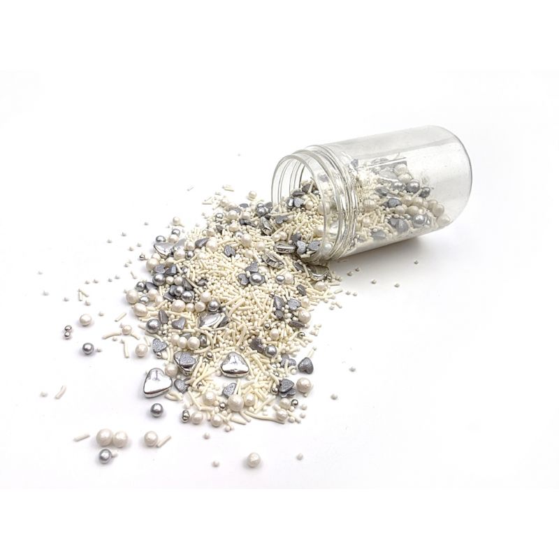 Dejte svým dortům a dezertům zcela nový nádech s tímto mixem cukrového zdobení. Bílé a stříbrné perličky, cukrové tyčinky a drobný máček vytváří stylovou kombinaci, kterou lze využít dle libosti. Můžete s nimi ozdobit cupcakes, dorty i vánoční cukroví. Posypky budou krásně vypadat na dortících nebo jiném pečivu. Ideální pro různé příležitosti, např. oslava narozenin, jmeniny, svatby, přijímání, rozlučky se svobodou, svátky. Posypky jsou baleny v praktické nádobě pro snadné dávkování a skladování. Skladujte na chladném a suchém místě mimo dosah slunečního záření. Pokud zdobení nasypete na vláčný krém, vlhkost z něj může posypek změkčit. Ale pozor, pokud bude zdobení na vlhkém krému delší dobu, může se z posypku uvolnit i barvivo a to na povrch krému. Pokud chcete, aby větší části dekorace drželi například na potahovém dortu, můžete tento druh zdobení k dortům lepit polotuhou čokoládou, nebo glazurou na perníčky. s posypky pracujte nejlépe nad miskou, či plechem s okrajem. Složení: bílý cukr, celozrnná mouka, rýžová mouka, suchý vaječný bílek, škrobový sirup, rafinovaný palmový olej, modifikovaný škrob, zahušťovadla: E412, E415, E466, E414; leštící látka kapol (šelak, rostlinný olej), mastek, kyselost regulátor kyselina citronová (E330), konzervant kyselina sorbová (E200), potravinářské aroma "Vanilka", potravinářská barviva: E122, E174, E124 Výživová (potravinová) hodnota 100 g výrobku: tuky - 3,4 g, z toho nasycené 0,19 g, sacharidy – 84,6 g, z toho cukry – 59 g, bílkoviny – 3,6 g, sůl – 0,001 g Energetická hodnota (kalorie) na 100 g výrobku: 375 kcal (1537 kJ).