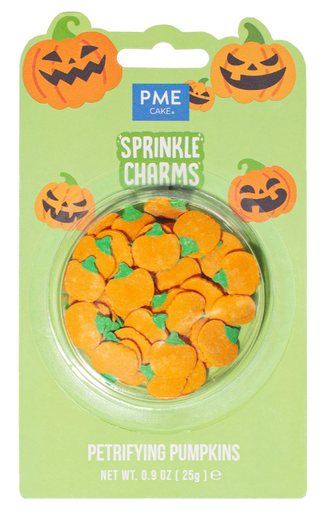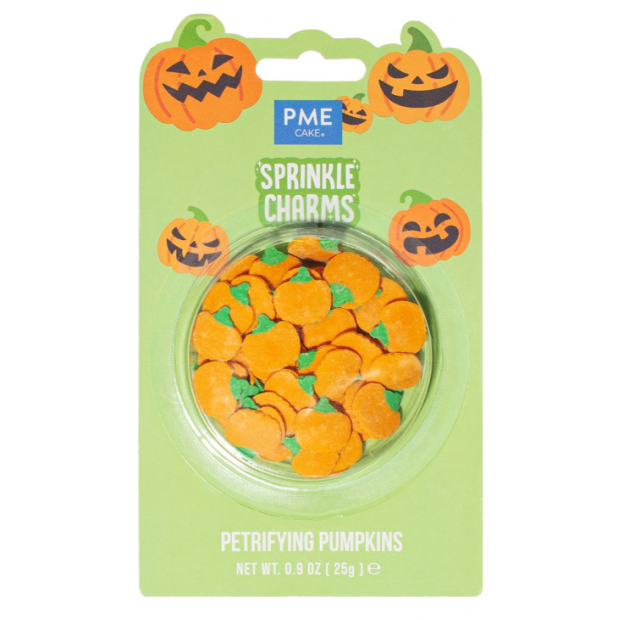 Přidejte na své dorty, cupcakes a zákusky strašidelný vzhled s těmito posypkami ve tvaru dýní od PME. Je jen na vás jak velké množství sypání použijete. Je ideální na ozdobu sušenek, muffinů, koblih a nejrůznějších pamlsků. 100% jedlé a bez barviv AZO. Ať už se účastníte halloweenské párty nebo pořádáte vlastní tematickou akci, nechte pavoučí posypku přidat kouzlo vašim sladkým výtvorům. Složení Dextróza, kukuřičný škrob, dextrin, zahušťovadlo (E414), protispékavá látka (E470b), aroma, lešticí látky (E904, E903), barvivo (E153)."