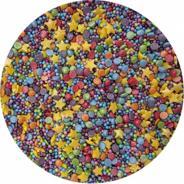 Dejte svým dortům a dezertům zcela nový nádech s tímto mixem cukrového zdobení. Různobarevné perličky, hvězdičky a máček vytváří stylovou kombinaci, kterou lze využít dle libosti. Můžete s nimi ozdobit cupcakes, dorty i vánoční cukroví. Posypky budou krásně vypadat na dortících nebo jiném pečivu. Ideální pro různé příležitosti, např. oslava narozenin, jmeniny, svatby, přijímání, rozlučky se svobodou, svátky. Posypky jsou baleny v praktické nádobě pro snadné dávkování a skladování. Skladujte na chladném a suchém místě mimo dosah slunečního záření. Pokud zdobení nasypete na vláčný krém, vlhkost z něj může posypek změkčit. Ale pozor, pokud bude zdobení na vlhkém krému delší dobu, může se z posypku uvolnit i barvivo a to na povrch krému. Pokud chcete, aby větší části dekorace drželi například na potahovém dortu, můžete tento druh zdobení k dortům lepit polotuhou čokoládou, nebo glazurou na perníčky. s posypky pracujte nejlépe nad miskou, či plechem s okrajem.
