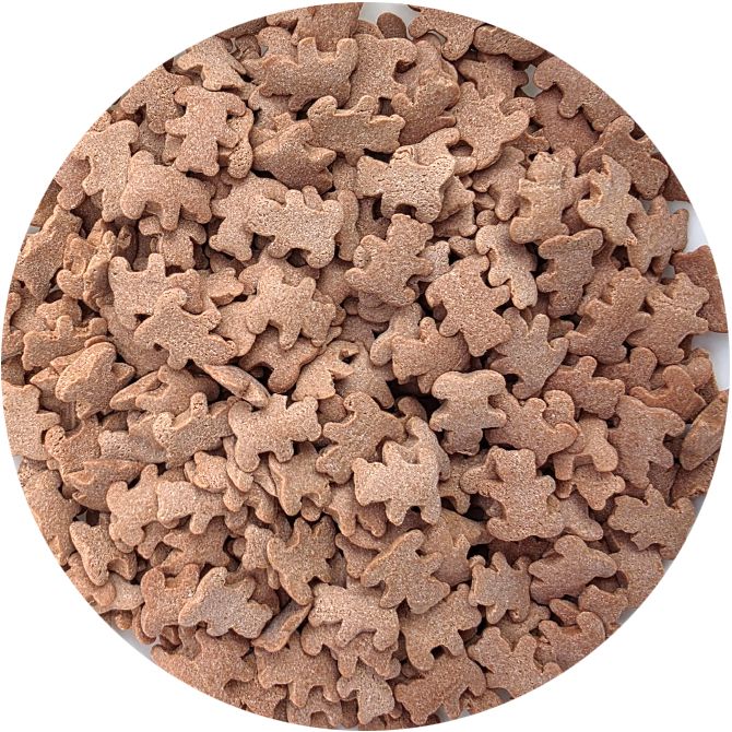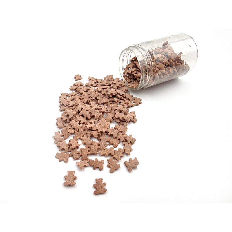 Zdobení z cukru ve tvaru malých hnědých roztomilých medvídků. Jsou perfektní na zdobení dortů, zmrzliny, zákusků a perníčků. Objevte kouzlo těchto jedlých dekorací, které promění každý dezert v umělecké dílo. Jsou to drobné akcenty, které dodávají lesk a jedinečnost vašim sladkým výtvorům. Jsou vyrobené z nejkvalitnějších surovin. Jejich povrchová úprava je inovativním přístupem k dekoraci, která vyčnívá z tradičních jedlých ozdob. Pokud zdobení nasypete na vláčný krém, vlhkost z něj může posypek změkčit. Ale pozor, pokud bude zdobení na vlhkém krému delší dobu, může se z posypku uvolnit i barvivo a to na povrch krému. Pokud chcete, aby větší části dekorace drželi například na potahovém dortu, můžete tento druh zdobení k dortům lepit polotuhou čokoládou, nebo glazurou na perníčky. s posypky pracujte nejlépe nad miskou, či plechem s okrajem.