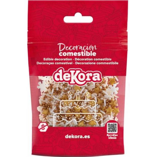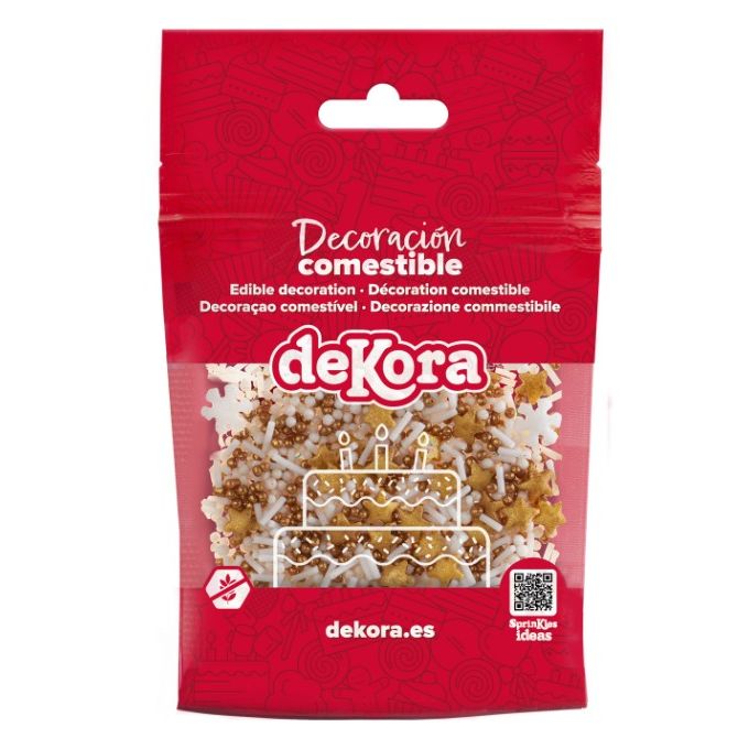 "SLAVNOSTNÍ A BAREVNÁ VÁNOČNÍ DEKORACE: Dodá vašim dezertům kouzelný a veselý nádech s touto směsí vánočních cukrových konfet v různých tvarech, jako jsou bílé a zlaté hvězdičky a vločky, ideální pro vytvoření sváteční atmosféry v každém soustu. VHODNÉ PRO VŠECHNY DRUHY DEZERTŮ A ZMRZLINY: Ideální pro zdobení muffinů, sušenek, sušenek, dortů, muffinů, cake pops a také pro dodání křupavého a originálního nádechu zmrzlině a jogurtům. BEZ LEPKU, BEZ LAKTÓZY A VHODNÉ PRO VEGETARIÁNY: Bezpečné cukrové konfety pro sdílení s rodinou a přáteli, přizpůsobené různým potravinovým potřebám a ideální pro bezstarostné vychutnání každého. PRAKTICKÝ 100G BLISTR SE ZIPEM: Samouzavírací nádoba udržuje posypky čerstvé a křupavé po každém použití, což umožňuje jejich uchování v perfektním stavu pro další výtvory. Product Dekora, standard v oblasti zdobení dortů a kreativního pečení, s kvalitními surovinami a designem navrženým tak, aby si mladí i staří užili kouzlo Vánoc v kuchyni. Rafinovaný slunečnicový olej s vysokým obsahem kyseliny olejové, cukr, voda, bramborový škrob, přírodní aroma (vanilka), E100, E172, E414, E904, rýžová mouka, barvivo E100, E172, lešticí látka: E414, E904 Alergeny: přírodní barviva, bez E171, bez lepku, bez laktózy, bez mléčných bílkovin Nutriční informace (na 100 g): Energie 414 kcal, Tuky 4 g (z toho nasycené 0,3 g), Sacharidy 95 g (z toho cukry 87 g), Bílkoviny 0,5 g, Sůl 1,01 g