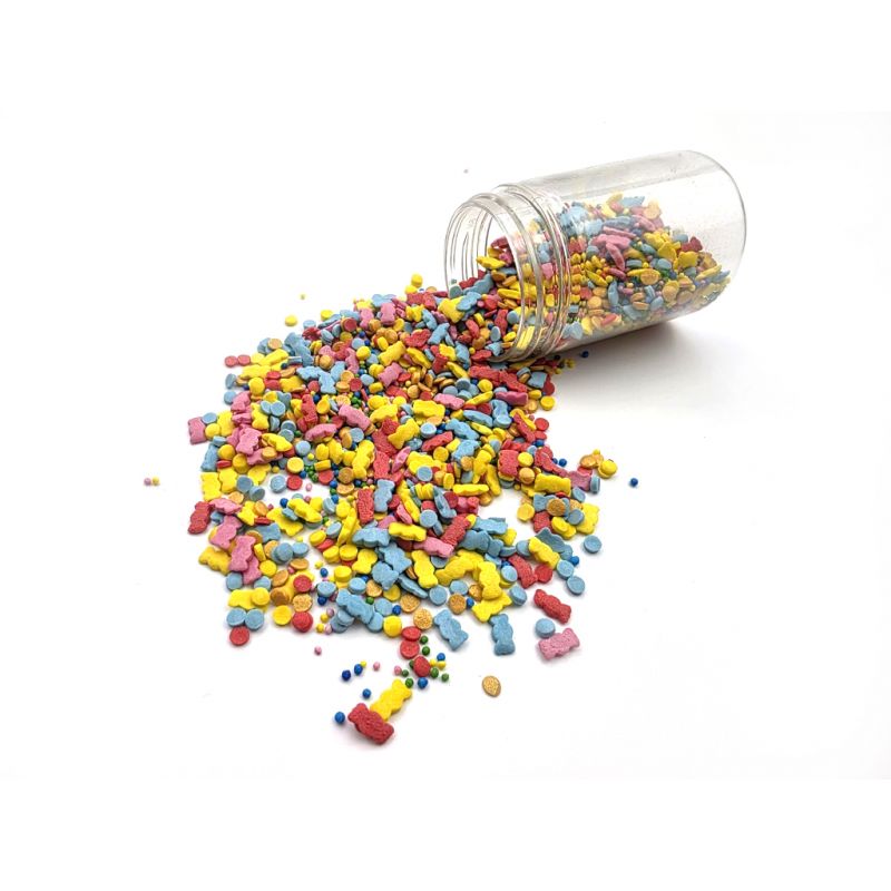 Vydejte se s tímto barevným cukrovým sypáním do vírů karnevalu. Krásné cukrové posypky I LOVE CAKES v různých tvarech vám pomohou zajímavým způsobem ozdobit muffiny, dorty, koláče, dezerty, cake pops, sušenky a další sladkosti. Posypky budou krásnou ozdobou pečiva na nejrůznější párty, výročí nebo na dort k narozeninám. Cukrové posypky se budou hodit při přípravě sladkostí na sladký stůl. Cukrové posypky jsou baleny v praktické nádobě pro snadné dávkování a skladování. Skladujte na chladném a suchém místě mimo dosah slunečního záření. Pokud zdobení nasypete na vláčný krém, vlhkost z něj může posypek změkčit. Ale pozor, pokud bude zdobení na vlhkém krému delší dobu, může se z posypku uvolnit i barvivo a to na povrch krému. Pokud chcete, aby větší části dekorace drželi například na potahovém dortu, můžete tento druh zdobení k dortům lepit polotuhou čokoládou, nebo glazurou na perníčky. s posypky pracujte nejlépe nad miskou, či plechem s okrajem.