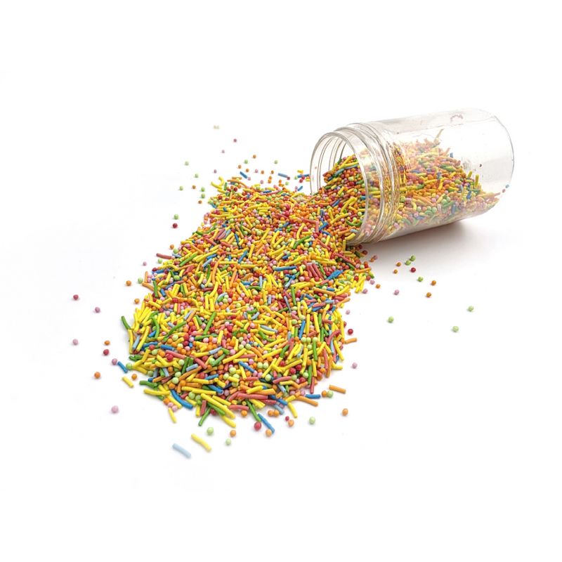 Sypání má podobu barevných cukrových tyčinek. Jedná se o sladký posyp z řady unikátních produktů od ILOVECAKES. Nemění chuť zdobených výrobků, je vyroben z přírodních barviv a má chuť cukrové pasty. Jedná se o velmi univerzální zdobení, ideální na dekorování cupcaků, sušenek, perníčků, muffinů, dortů, zákusků, pečiva, dortů, pralinek, lanýžů, čokolády, zmrzliny a mnoha dalších sladkých výrobků, zejména těch s krémy a polevou. Je vhodný pro každou příležitost: svatba, karneval, narozeniny, Den matek a mnoho dalších. Baleno v praktické šroubovací dóze.Pokud zdobení nasypete na vláčný krém, vlhkost z něj může posypek změkčit. Ale pozor, pokud bude zdobení na vlhkém krému delší dobu, může se z posypku uvolnit i barvivo a to na povrch krému. Pokud chcete, aby větší části dekorace drželi například na potahovém dortu, můžete tento druh zdobení k dortům lepit polotuhou čokoládou, nebo glazurou na perníčky. s posypky pracujte nejlépe nad miskou, či plechem s okrajem.