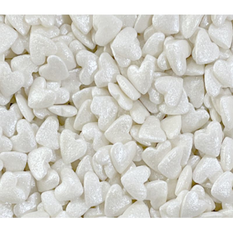 Cukrové zdobení metalická bílá srdíčka 80g - I LOVE CAKES