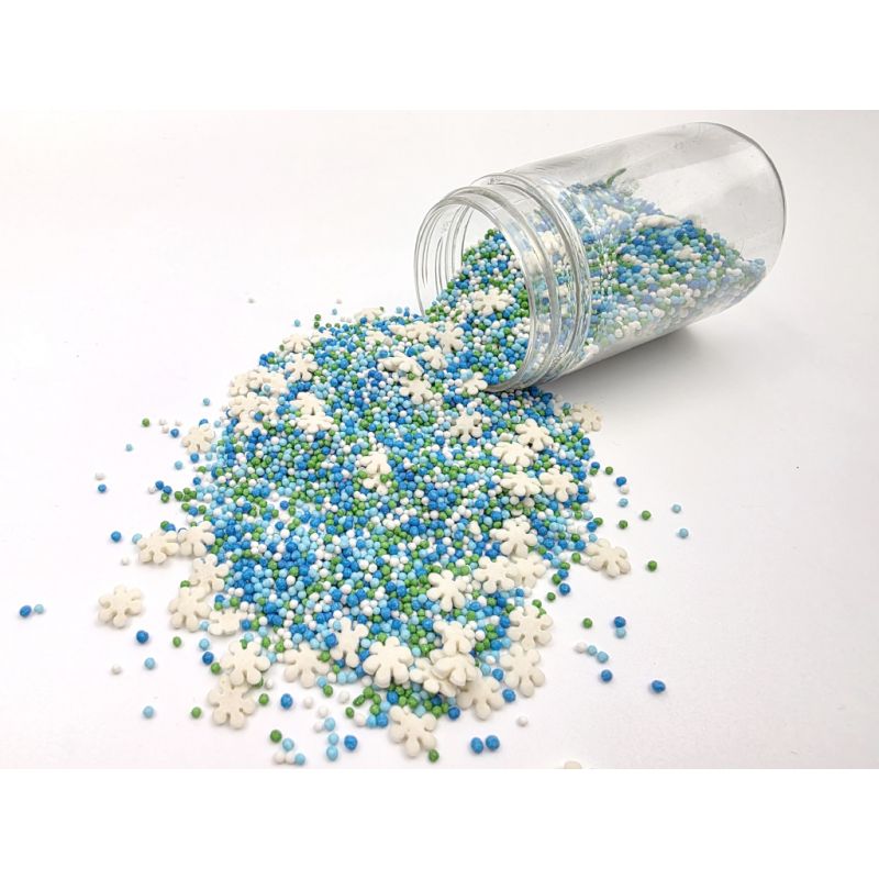 Bílé hvězdičky a barevný máček představují směs, která se vám hodí jak na vánoční dorty, tak na dorty s motivem Ledového království a dalších zimních pohádek. I LOVE CAKES v různých tvarech vám pomohou zajímavým způsobem ozdobit muffiny, dorty, koláče, dezerty, cake pops, sušenky a další sladkosti. Posypky budou krásnou ozdobou pečiva na nejrůznější párty, výročí nebo na dort k narozeninám. Cukrové posypky se budou hodit při přípravě sladkostí na sladký stůl. Posypky jsou baleny v praktické nádobě pro snadné dávkování a skladování. Skladujte na chladném a suchém místě mimo dosah slunečního záření.Pokud zdobení nasypete na vláčný krém, vlhkost z něj může posypek změkčit. Ale pozor, pokud bude zdobení na vlhkém krému delší dobu, může se z posypku uvolnit i barvivo a to na povrch krému. Pokud chcete, aby větší části dekorace drželi například na potahovém dortu, můžete tento druh zdobení k dortům lepit polotuhou čokoládou, nebo glazurou na perníčky. S posypkami pracujte nejlépe nad miskou, či plechem s okrajem."