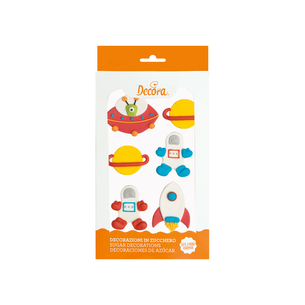 Cukrové dekorace ve tvaru vesmírných postaviček připravené k přímému použití. Jsou vyráběny ručně, s obsahem přírodních extrakčních barviv. Ideální pro zdobení dortů, košíčků a dalších dezertů. Tyto dekorace jsou již hotové, není potřeba je dále upravovat. Velikost postaviček je 3-5 cm.