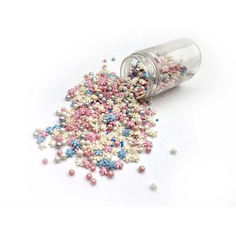 Cukrové posypky Rozkvetlá louka jsou barevné cukrové posypky ve tvaru kytiček a stříbrných perliček, které přenesou vaše pečivo a dezerty na slunnou louku plnou květin a motýlů. Tyto posypky jsou ideální pro zdobení dortů, cupcakes, dortů, dezertů a dalších sladkých pochoutek a dodají jim veselý jarní vzhled. Posypky jsou baleny v praktické nádobě pro snadné dávkování a skladování. Skladujte na chladném a suchém místě mimo dosah slunečního záření.Pokud zdobení nasypete na vláčný krém, vlhkost z něj může posypek změkčit. Ale pozor, pokud bude zdobení na vlhkém krému delší dobu, může se z posypku uvolnit i barvivo a to na povrch krému. Pokud chcete, aby větší části dekorace drželi například na potahovém dortu, můžete tento druh zdobení k dortům lepit polotuhou čokoládou, nebo glazurou na perníčky. S posypkami pracujte nejlépe nad miskou, či plechem s okrajem."
