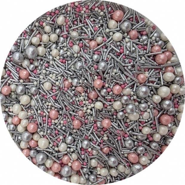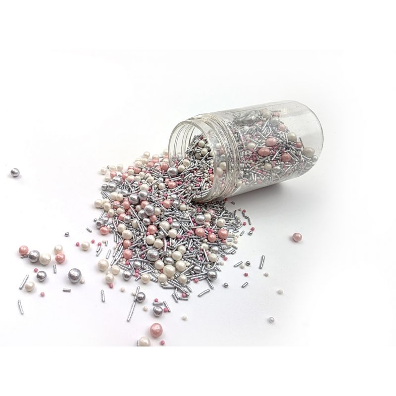 Dejte svým dortům a dezertům zcela nový nádech s tímto mixem cukrového zdobení. Různobarevné perličky, stříbrné tyčinky a drobný máček vytváří stylovou kombinaci, kterou lze využít dle libosti. Můžete s nimi ozdobit cupcakes, dorty i vánoční cukroví. Posypky budou krásně vypadat na dortících nebo jiném pečivu. Ideální pro různé příležitosti, např. oslava narozenin, jmeniny, svatby, přijímání, rozlučky se svobodou, svátky. Posypky jsou baleny v praktické nádobě pro snadné dávkování a skladování. Skladujte na chladném a suchém místě mimo dosah slunečního záření. Pokud zdobení nasypete na vláčný krém, vlhkost z něj může posypek změkčit. Ale pozor, pokud bude zdobení na vlhkém krému delší dobu, může se z posypku uvolnit i barvivo a to na povrch krému. Pokud chcete, aby větší části dekorace drželi například na potahovém dortu, můžete tento druh zdobení k dortům lepit polotuhou čokoládou, nebo glazurou na perníčky. s posypky pracujte nejlépe nad miskou, či plechem s okrajem. Složení: bílý cukr, celozrnná mouka, rýžová mouka, suchý vaječný bílek, škrobový sirup, rafinovaný palmový olej, modifikovaný škrob, zahušťovadla: E412, E415, E466, E414; leštící látka kapol (šelak, rostlinný olej), mastek, kyselost regulátor kyselina citronová (E330), konzervant kyselina sorbová (E200), potravinářské aroma "Vanilka", potravinářská barviva: E122, E174, E124 Výživová (potravinová) hodnota 100 g výrobku: tuky - 3,4 g, z toho nasycené 0,19 g, sacharidy – 84,6 g, z toho cukry – 59 g, bílkoviny – 3,6 g, sůl – 0,001 g Energetická hodnota (kalorie) na 100 g výrobku: 375 kcal (1537 kJ).