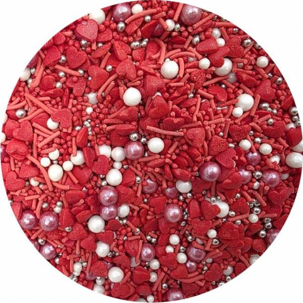 Dejte svým cukrářským výtvorům osobitý charakter s mixem červených srdíček a barevných perel. Tyto ozdobné částice představují rychlý způsob, jak elegantně ozdobit dorty, cupcakes, sušenky, perníčky, cake pops nebo zmrzlinu. Červená je klasická barva, která se hodí ke každé příležitosti – od Vánoc, přes Valentýna až po Halloween nebo Velikonoce. Zdobení se skvěle hodí k cukrové pastě, polevě, krémům a čokoládě. Dodá pečivu hloubku, kontrast a přitahuje pozornost – stačí jej posypat po povrchu dortu a okamžitě dosáhnete „wow“ efektu. Snadno se nanáší a je ideální jak pro domácí cukráře, tak pro profesionály. Pokud zdobení nasypete na vláčný krém, vlhkost z něj může posypek změkčit. Ale pozor, pokud bude zdobení na vlhkém krému delší dobu, může se z posypku uvolnit i barvivo a to na povrch krému. Pokud chcete, aby větší části dekorace drželi například na potahovém dortu, můžete tento druh zdobení k dortům lepit polotuhou čokoládou, nebo glazurou na perníčky. s posypky pracujte nejlépe nad miskou, či plechem s okrajem.