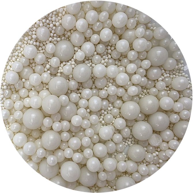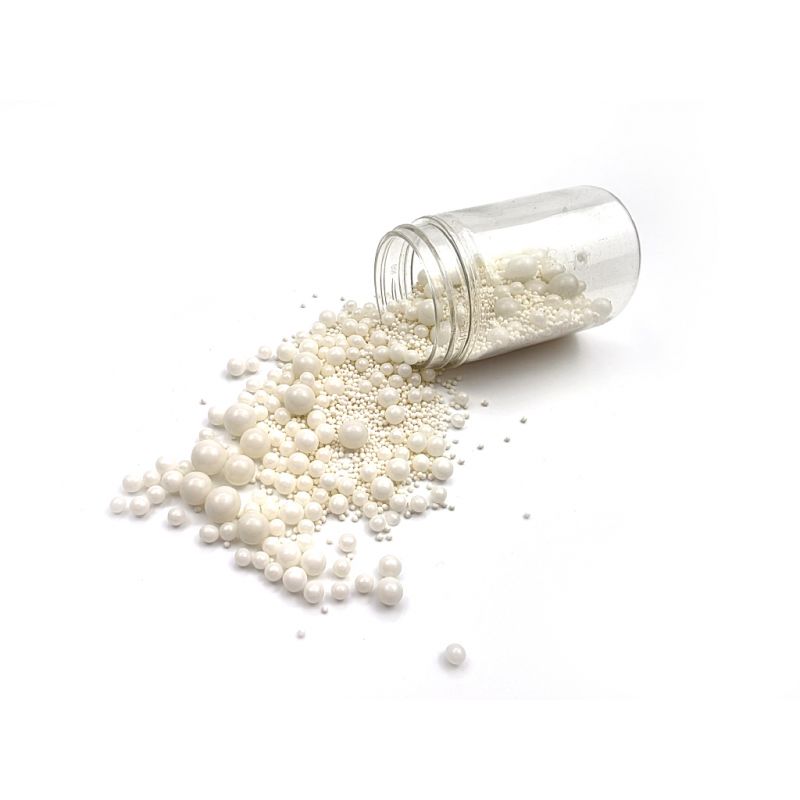 Sypání má podobu různě velkých perliček v bílé barvě. Jedná se o sladký posyp z řady unikátních produktů od ILOVECAKES. Nemění chuť zdobených výrobků, je vyroben z přírodních barviv a má chuť cukrové pasty. Jedná se o velmi univerzální zdobení, ideální na dekorování cupcaků, sušenek, perníčků, muffinů, dortů, zákusků, pečiva, dortů, pralinek, lanýžů, čokolády, zmrzliny a mnoha dalších sladkých výrobků, zejména těch s krémy a polevou. Je vhodný pro každou příležitost: svatba, karneval, narozeniny, Den matek a mnoho dalších. Baleno v praktické šroubovací dóze. Pokud zdobení nasypete na vláčný krém, vlhkost z něj může posypek změkčit. Ale pozor, pokud bude zdobení na vlhkém krému delší dobu, může se z posypku uvolnit i barvivo a to na povrch krému. Pokud chcete, aby větší části dekorace drželi například na potahovém dortu, můžete tento druh zdobení k dortům lepit polotuhou čokoládou, nebo glazurou na perníčky. s posypky pracujte nejlépe nad miskou, či plechem s okrajem.