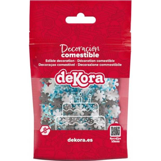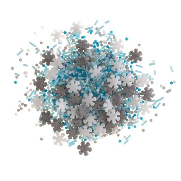 Tato elegantní směs bílé, stříbrošedé a ledově modré posypky obsahuje jemné cukrové vločky, perličky a tyčinky – vytváří sněhový efekt, který je ideální pro zimní oslavy.