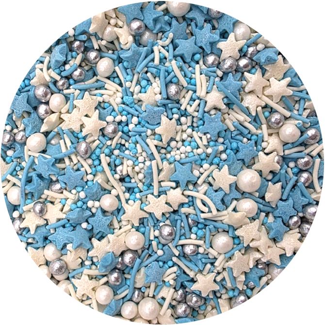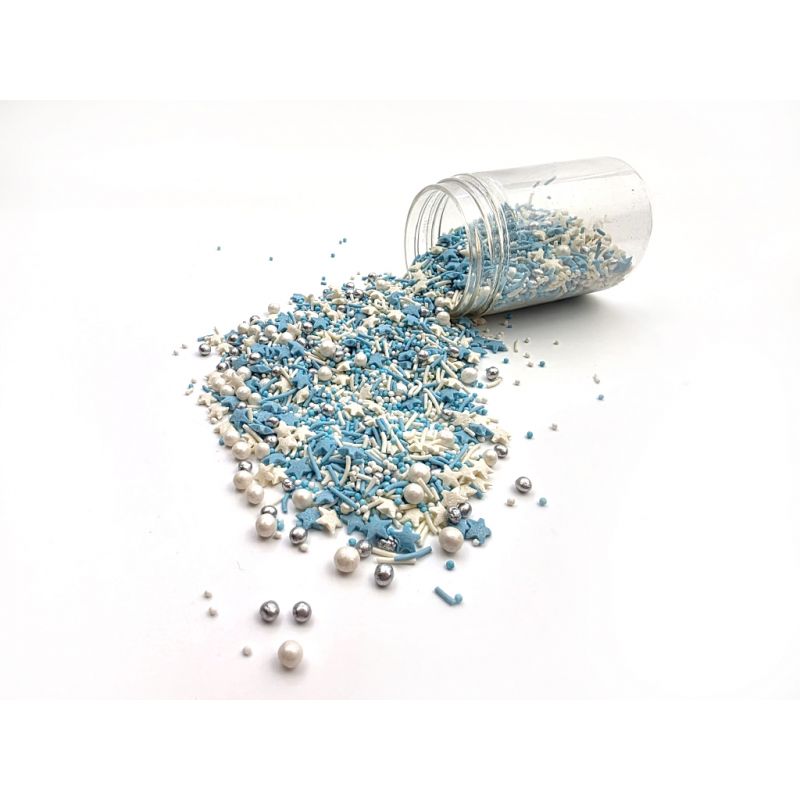 Bílé a modré hvězdičky, stříbrné a bílé perličky jsou smíchané do Zimní pohádky, která se vám hodí jak na vánoční dorty, tak na dorty s motivem Ledového království a dalších zimních pohádek. I LOVE CAKES v různých tvarech vám pomohou zajímavým způsobem ozdobit muffiny, dorty, koláče, dezerty, cake pops, sušenky a další sladkosti. Posypky budou krásnou ozdobou pečiva na nejrůznější párty, výročí nebo na dort k narozeninám. Cukrové posypky se budou hodit při přípravě sladkostí na sladký stůl. Posypky jsou baleny v praktické nádobě pro snadné dávkování a skladování. Skladujte na chladném a suchém místě mimo dosah slunečního záření.Pokud zdobení nasypete na vláčný krém, vlhkost z něj může posypek změkčit. Ale pozor, pokud bude zdobení na vlhkém krému delší dobu, může se z posypku uvolnit i barvivo a to na povrch krému. Pokud chcete, aby větší části dekorace drželi například na potahovém dortu, můžete tento druh zdobení k dortům lepit polotuhou čokoládou, nebo glazurou na perníčky. S posypkami pracujte nejlépe nad miskou, či plechem s okrajem."