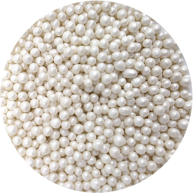 Bílé perly vyrobené z rýžových lupínků a cukru. Jsou perfektní na zdobení dortů, zmrzliny, zákusků a perníčků. Objevte kouzlo těchto perel, které promění každý dezert v umělecké dílo. Jsou více než jen dekorace - jsou to drobné akcenty, které dodávají lesk a jedinečnost vašim sladkým výtvorům. Jsou vyrobené z nejkvalitnějších surovin. Jejich povrchová úprava je inovativním přístupem k dekoraci, která vyčnívá z tradičních jedlých ozdob. Pokud zdobení nasypete na vláčný krém, vlhkost z něj může posypek změkčit. Ale pozor, pokud bude zdobení na vlhkém krému delší dobu, může se z posypku uvolnit i barvivo a to na povrch krému. Pokud chcete, aby větší části dekorace drželi například na potahovém dortu, můžete tento druh zdobení k dortům lepit polotuhou čokoládou, nebo glazurou na perníčky. s posypky pracujte nejlépe nad miskou, či plechem s okrajem.