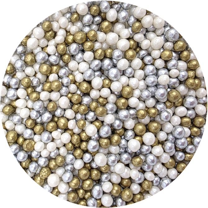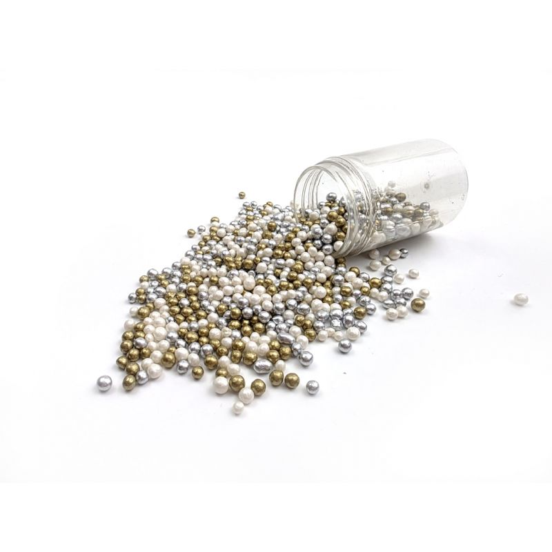 5 mm velké zlaté, bílé a stříbrné perly jsou vyrobené z rýžových lupínků a cukru. Jsou perfektní na zdobení dortů, zmrzliny, zákusků a perníčků. Objevte kouzlo těchto perel, které promění každý dezert v umělecké dílo. Jsou více než jen dekorace - jsou to drobné akcenty, které dodávají lesk a jedinečnost vašim sladkým výtvorům. Jsou vyrobené z nejkvalitnějších surovin. Jejich povrchová úprava je inovativním přístupem k dekoraci, která vyčnívá z tradičních jedlých ozdob. Pokud zdobení nasypete na vláčný krém, vlhkost z něj může posypek změkčit. Ale pozor, pokud bude zdobení na vlhkém krému delší dobu, může se z posypku uvolnit i barvivo a to na povrch krému. Pokud chcete, aby větší části dekorace drželi například na potahovém dortu, můžete tento druh zdobení k dortům lepit polotuhou čokoládou, nebo glazurou na perníčky. s posypky pracujte nejlépe nad miskou, či plechem s okrajem.