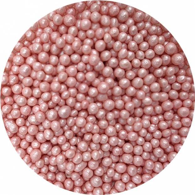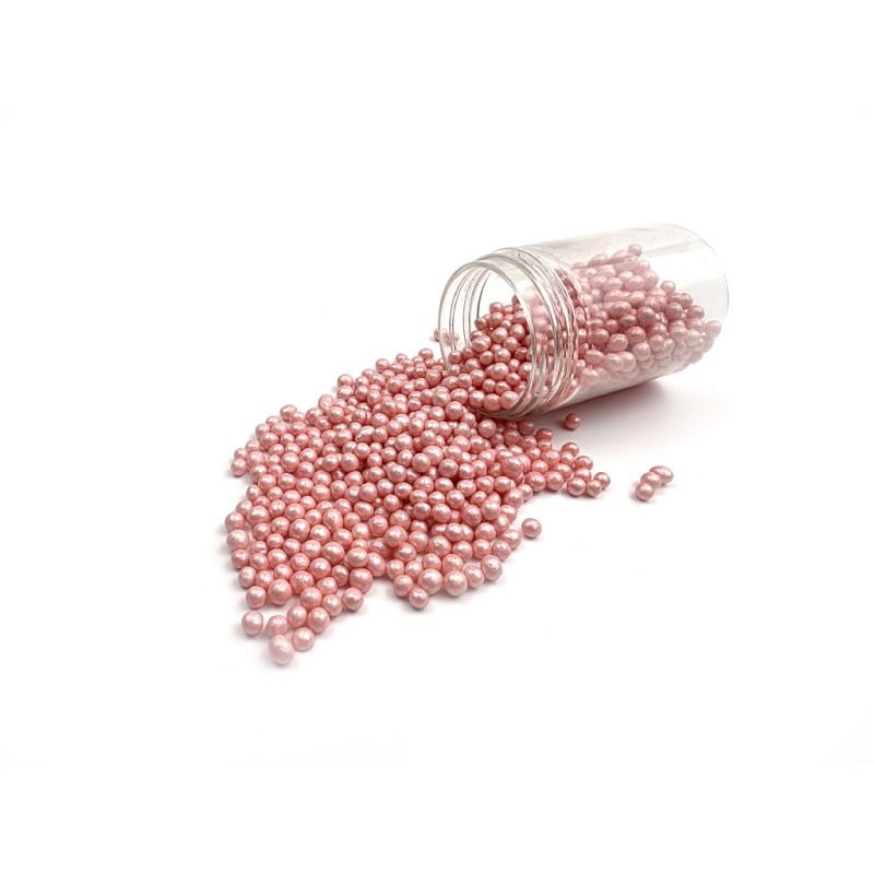 Růžové perleťové perly vyrobené z rýžových lupínků a cukru. Jsou perfektní na zdobení dortů, zmrzliny, zákusků a perníčků. Objevte kouzlo těchto perel, které promění každý dezert v umělecké dílo. Jsou více než jen dekorace - jsou to drobné akcenty, které dodávají lesk a jedinečnost vašim sladkým výtvorům. Jsou vyrobené z nejkvalitnějších surovin. Jejich povrchová úprava je inovativním přístupem k dekoraci, která vyčnívá z tradičních jedlých ozdob.Pokud zdobení nasypete na vláčný krém, vlhkost z něj může posypek změkčit. Ale pozor, pokud bude zdobení na vlhkém krému delší dobu, může se z posypku uvolnit i barvivo a to na povrch krému. Pokud chcete, aby větší části dekorace drželi například na potahovém dortu, můžete tento druh zdobení k dortům lepit polotuhou čokoládou, nebo glazurou na perníčky. s posypky pracujte nejlépe nad miskou, či plechem s okrajem.