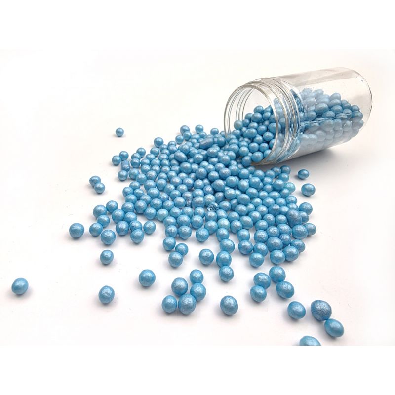 7 mm velké modré perleťové perly jsou vyrobené z rýžových lupínků a cukru. Jsou perfektní na zdobení dortů, zmrzliny, zákusků a perníčků. Objevte kouzlo těchto perel, které promění každý dezert v umělecké dílo. Jsou více než jen dekorace - jsou to drobné akcenty, které dodávají lesk a jedinečnost vašim sladkým výtvorům. Jsou vyrobené z nejkvalitnějších surovin. Jejich povrchová úprava je inovativním přístupem k dekoraci, která vyčnívá z tradičních jedlých ozdob. Pokud zdobení nasypete na vláčný krém, vlhkost z něj může posypek změkčit. Ale pozor, pokud bude zdobení na vlhkém krému delší dobu, může se z posypku uvolnit i barvivo a to na povrch krému. Pokud chcete, aby větší části dekorace drželi například na potahovém dortu, můžete tento druh zdobení k dortům lepit polotuhou čokoládou, nebo glazurou na perníčky. s posypky pracujte nejlépe nad miskou, či plechem s okrajem.