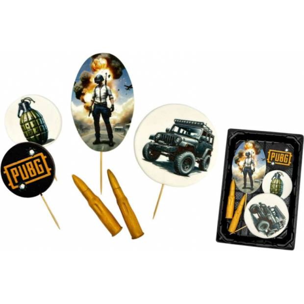 Sada cukrových zápichů s oblíbeným motivem PUBG. Tyto potisky cukrových zápichů jsou vyráběny na profesionální certifikované tiskárně, která používá jedlé inkousty. Tisk inkousty určenými pro tisk na oplatky a cukrovou pastu v souladu s normami pro potravinářské výrobky.