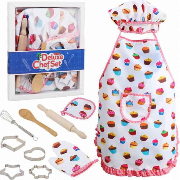 Každá dívka ráda pomáhá své mamince v kuchyni, přidává ingredience, míchá produkty, takže je těžké si představit vaření bez vhodné zástěry, která chrání oblečení dítěte od špíny. Nabízíme krásnou sadu pro každého malého kuchyňského pomocníka skládající se ze zástěry, kuchařské čepice, chňapky a náčiní nezbytného k vaření. Tato roztomilá sada osloví každou dívku, která ráda pomáhá a hraje si na kuchařku. Skvěle se bude hodit ke každé dětské kuchyňce. Sada obsahuje kuchařskou čepici, zástěru, chňapku, podložku pod hrnec, dřevěný váleček, metličku, vařečku a vykrajovátka.
