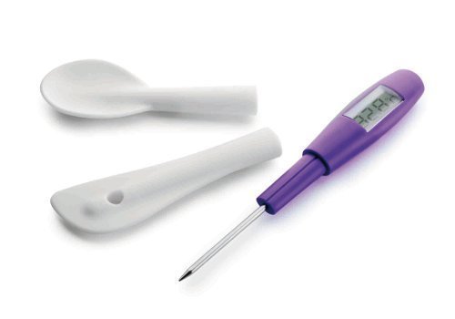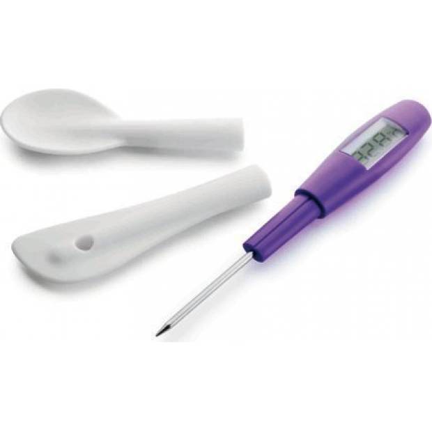 Kuchyňský teploměr s digitálním ukazatelem je vybavený třemi samostatnými snadno vyměnitelnými nástavci pro měření teploty různých potravin a jídel. Špičatá jehla se využívá na maso nebo pečení, silikonový nástavec v podobě lžíce třeba na polévky nebo omáčky a stěrka na krémy, náplně… Teplotní rozpětí: -50°C až 300°C.